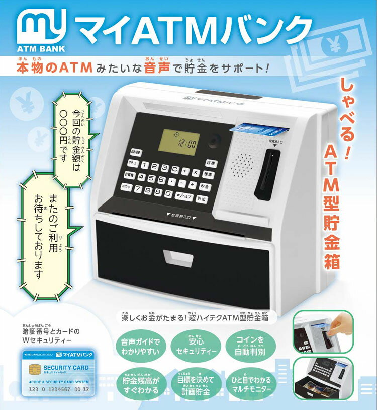 ■商品サイズ(cm)幅約25.5×奥行約14×高さ約20.5■商品重量約970g■材質本体:HIPSカード:PVC■電源単3電池3本(別売)本物のATMみたいな音声で楽しくお金がたまる。